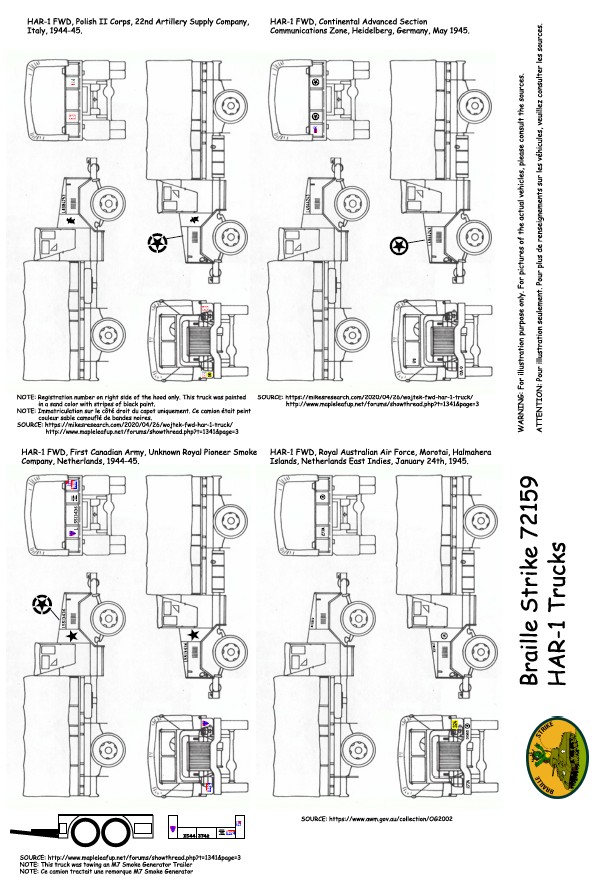 Planche de décalcomanies contenant les décorations pour 4 camions HAR-1 FWD: