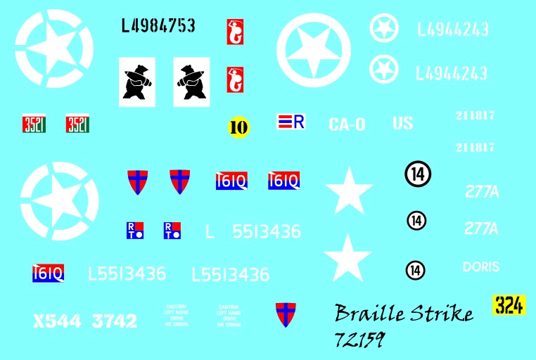 CONSEILS D’UTILISATION: Appliquer une couche de vernis brillant sur la surface de la maquette avant d’y apposer les decals, puis une autre couche par-dessus les decals pour les protéger lors de la patine, et éviter de voir les contours.