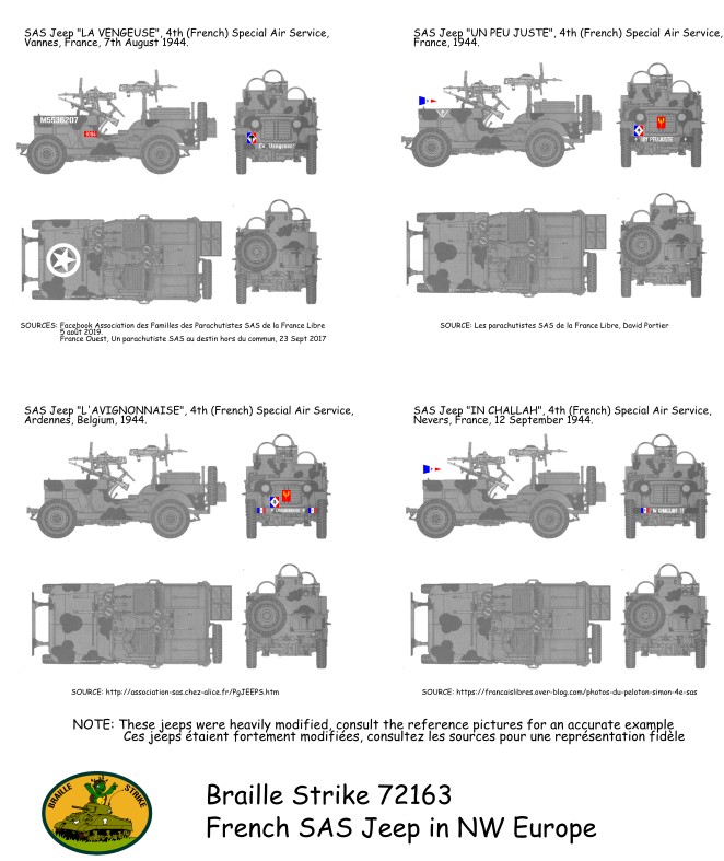 Planche de décalcomanies contenant les décorations pour 4 Jeeps appartenant au Special Air Service français: